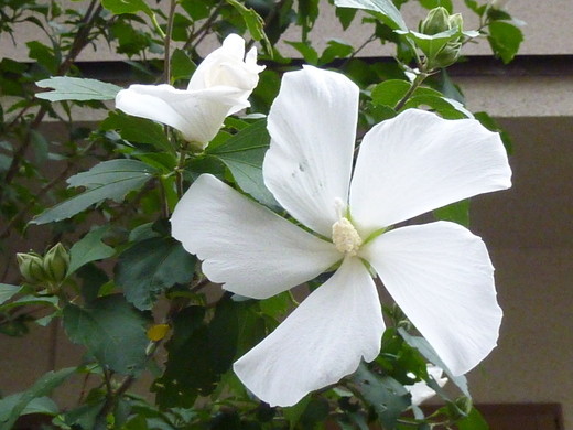 ムクゲ。アオイ科ヒビスクス属。フヨの仲間で多くの品種がある。識別ポイント 1日花が次々と咲き溢れる。名前の由来 中国名「木槿」の和音読み。花ことば 強い精神力。