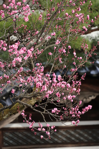 車で通りかかったところ、鮮やかな紅梅と、歴史を感じる建物が印象的だったので