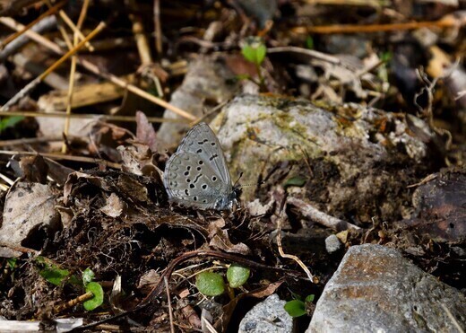 気温が上がって夏日となり、スギタニルリシジミの♂が吸水にやって来た。近い仲間には、ヤクシマルリシジミ(屋久島)、カラフトルリシジミ(樺太)、オガサワラシジミ(小笠原)、サツマシジミ(薩摩)と地名が付くが、このシジミチョウには、杉谷岩彦博士の名が付けられている。