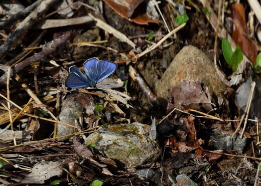 スギタニルリシジミの♂の翅表は暗藍色なので、慣れてくると飛翔中の個体でも、ルリシジミと判別がつくようになる。かなり強い光が当たっていたせいか、初めて、メタリックブルーに見えた。(♀は通常でも、中央部が少し紫青色に輝く)