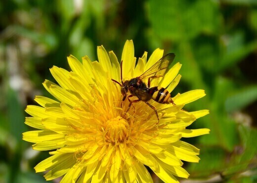 タンポポで吸蜜するアシナガバチに似た蜂を発見。よく見ると腹部が短く、脚も長くない。触角と脚が赤褐色で、腹部と背中の黄色斑紋から、ダイミョウキマダラハナバチと判断した。ヒゲナガハナバチの巣に寄生(餌を横取りする労働寄生)する。♂が見つかっておらず、♀だけで子孫を残す単為生殖をすると考えられている。