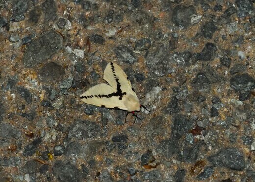 エゾヨツメを狙ってライトトラップをしていると、白い蛾が飛来した。白色の前翅に黒条を持つ近縁種がいるが、フトスジモンヒトリは黒い筋が格段に太い。後翅も白くて清楚な装いだが、ヒトリガの仲間には、後翅に鮮やかな色彩を持つものもいる。ヒトリガ科。