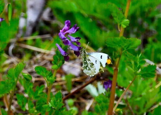 ツマキチョウの♂が吸蜜している紫華鬘(ムラサキケマン)はケシ科の越年草。花の色が紫色をして、形が仏殿に吊るす仏具の華鬘(けまん)に似ていることから名づけられた。ウスバシロチョウの幼虫の食草で、プロトピンを含む有毒植物。誤食すれば嘔吐・呼吸麻痺・心臓麻痺などを引き起こす。
