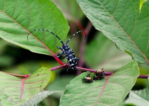 ブーンという音とともにカミキリが飛来し、マメコガネの近くにとまった。ゴマダラカミキリによく似たツヤハダゴマダラカミキリが、中国・朝鮮半島から侵入し、特定外来生物に指定されて駆除対象となっている。この個体は前胸背と上翅会合部の白紋から在来種のゴマダラカミキリ。