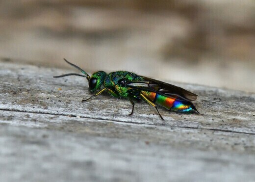 約1ヶ月間、ホソセイボウを撮影してきたが、直射日光の当たらない場所では静止することに気付いた。105mmマイクロレンズに付け替えて、体表の点刻や微毛も撮影できた。側面から見ると、虹色の模様はムツバセイボウにそっくり。見れば見るほど判別に迷うが、末端の四歯の中央に大きな腹部末端が突出している。撮影地の市町村と撮影日は秘密。