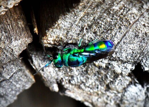暑くなるとヤマトルリジガバチの活動が活発になり、今までにない位の多くの個体を見かけた。これを宿主とするミドリセイボウも姿を見せ始めた。105mmマイクロレンズで撮影してみると、体表の点刻や微毛も写っていた。地権者とのトラブルを避けるため、撮影地の市町村と撮影日は秘密。
