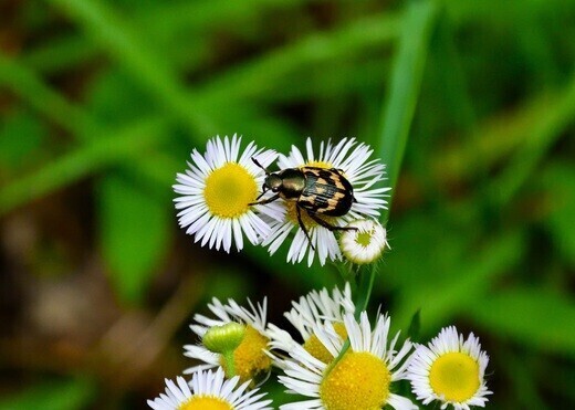 セマダラコガネは小型のコガネムシで、日本各地に普通。山間部へ行けば、多くの個体に出会う。前胸背と前翅に黒い斑模様があるが、個体変異も大きく、白っぽいものから黒いものまでさまざま。マメコガネと同じくらいに、成虫も幼虫も植物食性の農業害虫で、海外でも被害をもたらしている。