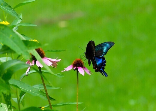 黄色い花を付けるオオハンゴウソウ(ルドベキア属)とムラサキバレンギク(エキナセア属)はどちらもキク科に属し、同じ頃に開花を迎える。また、花弁が放射状に広がる花の姿が似ているので、混同されやすい。このミヤマカラスアゲハの夏型♂が吸蜜しているのは、ムラサキバレンギク?