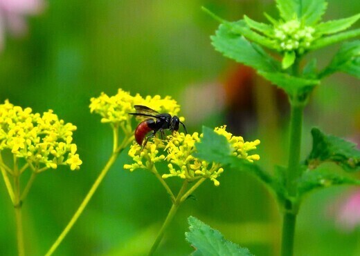 ハラアカヤドリハキリバチは、ルリモンハナバチに似た方法で子孫を残す。オオハキリバチの巣に侵入し、幼虫のために保存していた餌に産卵して巣を乗っ取る。このように他人(他虫)の労働の成果をちゃっかりと奪う行為は「労働寄生」と呼ばれている。