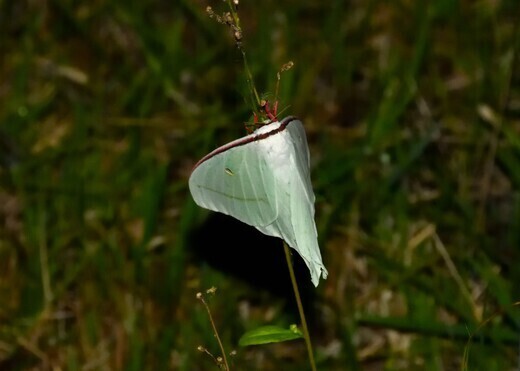 一見、ヤママユガ科のオオミズアオに見えるが、立体的なとまり方をしているのでオナガミズアオと判断。昆虫に詳しい人でも、蛾の専門家でないと判別に迷う。同時期に発生して、両種とも灯火に集まるが、尾(尾状突起)の長さは判別点にならない。