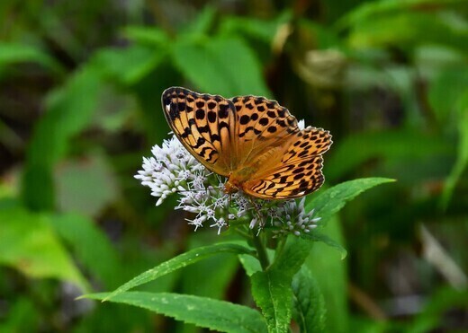 ヒョウモンチョウの仲間は似たものが多いが、後翅裏面にそれぞれの特徴がある。また、大型ヒョウモンの♀は、前翅表面の先端に白紋を持つものが多い。ヨツバヒヨドリで吸蜜しているこの個体は、前翅先端が少し横に膨れたオオウラギンスジヒョウモンの♀。