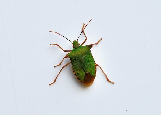 ツノアオカメムシは、山地で見られる金属光沢をもつ緑色の美しいカメムシ。 両肩の突き出たでっぱり(側角)は、アメフト選手のプロテクターの様に見える。アオクチブトカメムシに似るが、側角がやや前方に向かって突出し、先端が斜めに切れている。灯りに集まるようで、早朝の自販機にくっついていた。
