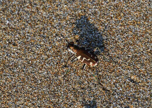 カワラハンミョウを探してみたが、なかなか見つからない。陽が傾いてきた頃に、茶色系のハラビロハンミョウを見つけた。名前の通り、確かに他のハンミョウより胴体の幅は広い。15年前は、この砂浜では見かけなかったが、最近は個体数を増やしているように思う。