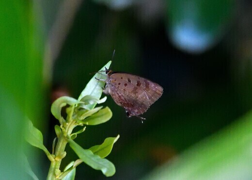 40年前の北陸では、ムラサキツバメを見ることは滅多になく、幻のチョウであった。温暖化で生息しやすくなったようで、梅雨の頃に、マテバシイで多数の幼虫が確認されていた。8月下旬から発生したようで、柔らかい新芽に産卵する♀を撮影できた。