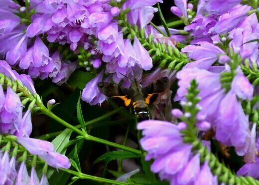 日本の南岸を台風が通過して大雨をもたらしたが、午後から金沢市は晴れてきた。雲が多いうちは、大雨で倒れたハナトラノオに、何頭ものモンキアゲハ、ホシホウジャクが吸蜜にやって来た。日差しが強くなると、スズメガの仲間らしく何処へともなく姿を消した。
