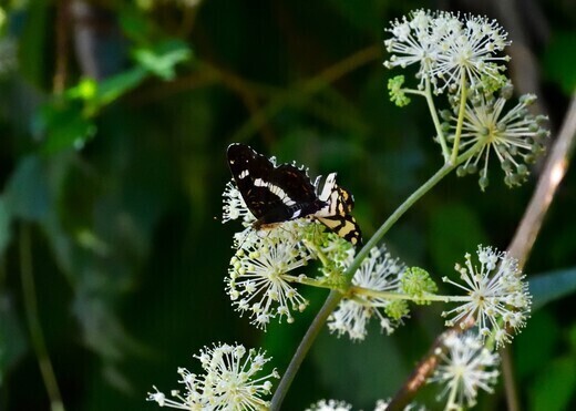 ウドの花は、8月から9月にかけ、茎の先端や上部の葉の付け根から伸びた花茎に小さな花が球形に集まって咲く。1つ1つの粒が蕾で、線香花火がはじけるように白い花が開く。天婦羅にして食べると美味しいらしい。ちょうどサカハチチョウとキンモンガが仲良く吸蜜していた。