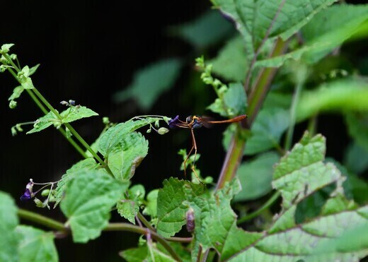 消化不良などの健胃薬とされているクロバナヒキオコシは、重要な吸蜜植物のようで、何度も吸蜜にやって来た。触角が根元まで黒く、後脚の脛節から跗節の黄色部が長いので、「スズキハラボソツリアブ」。ジャスピンに近い写真でないと、判別できない。