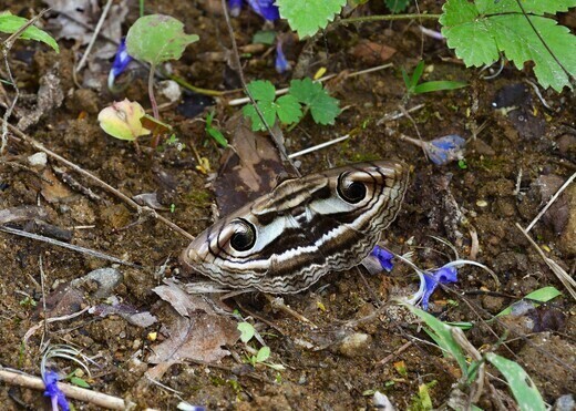 花壇の周りを歩いていると、黒いものが飛んで地面にとまった。そっと近づくと、大きな目玉模様が見えるので、オスグロトモエか、非常によく似たハグルマトモエの♀。眼状紋の外側の2本の横線の幅がほぼ平行に近いため、オスグロトモエと判断した。じっと見ていると、本当の目のように見えてくる。ヤガ科、シタバガ亜科。