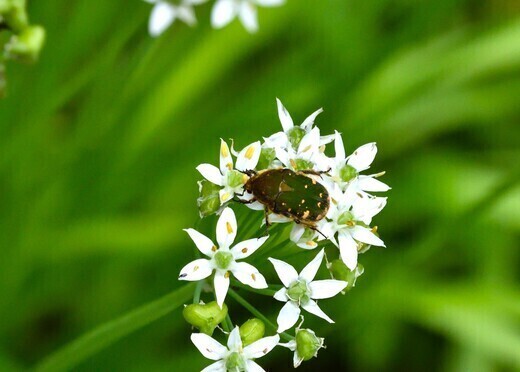 白いニラの花に来ていた小さな緑色のハナムグリ。葯を齧ったり、蜜を舐めたりしていた。体表や胴体に黄褐色の毛があるので、アオハナムグリでない。大きさでナミハナムグリでもない。この日、多数のコアオハナムグリが、空の駅のフジバカマにも来ていた。