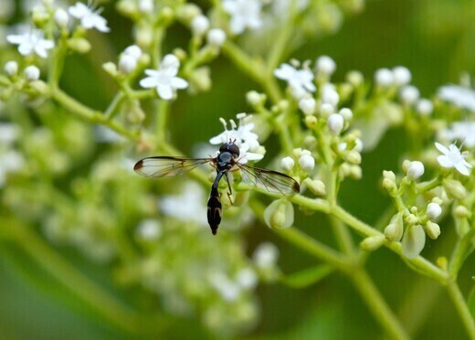 すぐ近くの花にとまったので、腹部の模様を撮影。調べてみると、ハナアブ科のツマグロコシボソハナアブ。♂の翅は全体に黒ずんだ色をしているが、この個体は翅が透明で端だけが黒いので♀。体長約10㎜と目立たないので、今まで見逃していたようだ。