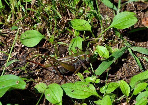 腹部の末端に立派な産卵管のあるキリギリスの♀。成虫になって2ケ月近く経つので、すでに産卵を終えている?幼虫時代は綺麗な緑色なのに、生活している場所のせいか、成虫になると茶褐色を帯びる。よく似たヤブキリは、成虫になっても緑色が鮮やか。