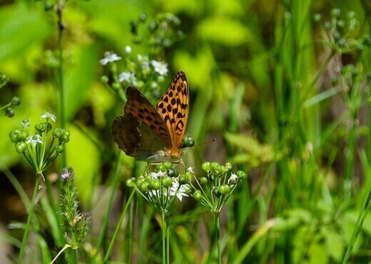 前翅の先端部に白紋のあるオオウラギンスジヒョウモンの♀がニラの花にやって来た。後翅裏面に銀白色の筋状の模様があり、その外側は濃い紫褐色。7月の発生期には既に気温が高かったため、活動せず夏眠に入ったようで、破損がほとんどなかった。