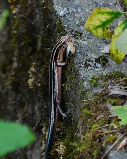 ぴょんと跳ねたコオロギを目にも止まらぬ速さで追いかけ、獲物をゲットしたニホントカゲ。幼体の尻尾は非常に鮮やかな青色。捕食者の注意を尻尾に向けさせることで胴体を守っている。成体になると尻尾の色はくすんだ青や茶色に変わり、胴体も茶褐色になる。