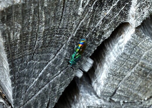 1ヶ月以上、晩夏に現れるムツバセイボウを探し続けてきたが、気温が下がったタイミングで、漸く姿を見せた。動きまわるので、主に初夏から現れるよく似たホソセイボウと区別がつかない。久しぶりに見た腹部のレインボーカラーがとても美しい。地権者とのトラブルを避けるため、撮影地の市町村と撮影日は秘密。