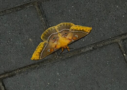 昨年は全く出会いのなかったクロウスタビガ。更に寒くなると現れるウスタビガは、翅表全体が山吹色だが、クロウスタビガは薄い黒色部が広くみられる。この場所では、金沢市より1週間ほど早く発生するようで、少しスレた個体であった。触角が細いので♀。
