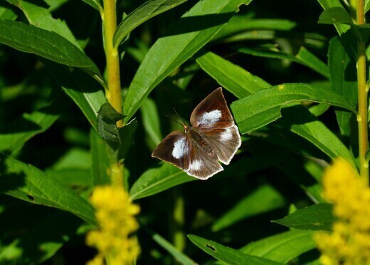 かなり秋が深まってきても、セイタカアワダチソウが満開。ウラギンシジミの♀が、翅を全開にして休んでいた。オレンジ色の紋の♂と異なり、白い紋の♀は清楚な雰囲気。秋型は前翅の先端が尖った形になる。このまま成虫で越冬して、来春に産卵する。