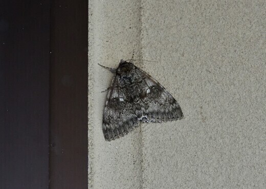 建物の壁を見ると、大型の Catocala が1頭。前翅しか見えないが、シロシタバならば、銀色がかった灰色地に、地衣類に似た白斑が散らばっているはず。黒の複雑な模様に白紋が左右に1個ずつ。すでに11月に入っているが、もしかしたらアレかな?と思いながら、秘密の方法で足元へおろした。