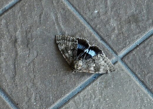下におろした大型のカトカラは、いい具合に前翅を開いて後翅を見せてくれた。黒地に綺麗な青紫帯、予想通りのムラサキシタバ。やや山地に生息し、目にすることはほとんどない。実に10年振りくらいの出会い。夏に発生するらしいが、寒くなると灯火にやって来る。自然人ネットに初登場?ヤガ科、シタバガ亜科。