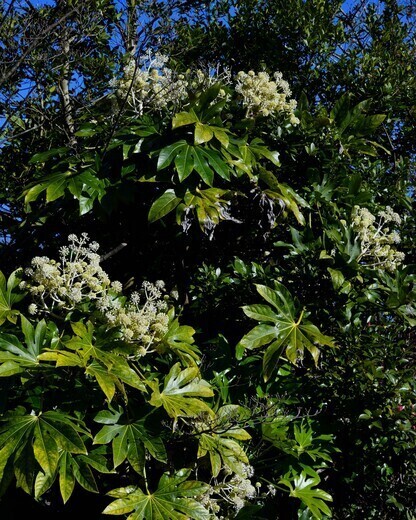 ヤツデはウコギ科の常緑低木で丈夫なため、古くから日陰になりやすい場所の庭木として植えられてきた。また、人の手の形をした葉の形から、集客運や金運を高める縁起の良い植物とされている。葉形から「八手」と書くが、一般には7、9、11と奇数に分裂し、8裂はしない。大天狗または力の強い天狗が持つ団扇は、強力な神通力があるとされる。