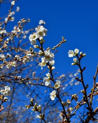 珍しくよく晴れた日に山間部を車で走っていると、白っぽい花を付けた木が目に留まった。樹形から桜と判断したが、花が梅に似ている。梅は1つの節に花柄のない花を1つ付け、花弁の先が丸い。同じバラ科の桃は1つの節に花柄の短い花を2つ付け、花弁の先端が尖る。桜は1つの節に複数の花を付け、花弁の先が割れているらしい。