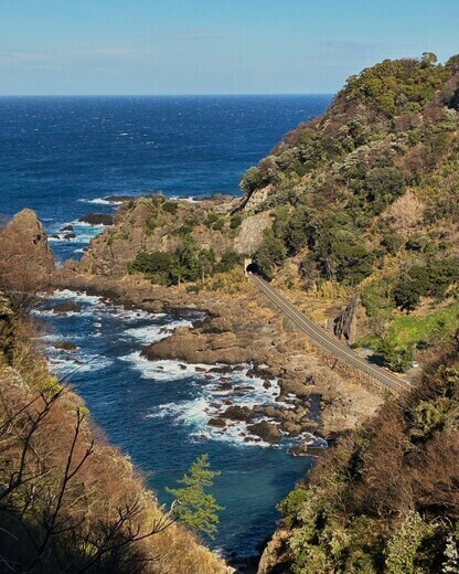 集落の駐車場から、環境省の看板を頼りに遊歩道を徒歩5分で展望所に着く。日本海と岩石海岸沿いを走る国道がよく見えるが、崖下の呼鳥門は見えない。