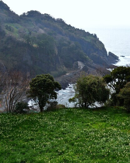 梨子ヶ平台地の近くから眼下を覗くと、波と風の浸食によってできた呼鳥門と左の端に漁火街道(国道)の黄色のセンターライン・呼鳥門トンネルの入り口が見える。トンネルの上が梨子ヶ平園地。