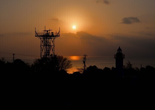 日没が近づいてくると、太陽高度がだいぶ下がってきた。海上にオレンジの光の筋ができてきたが、もうすぐ雲に隠れてしまいそう。