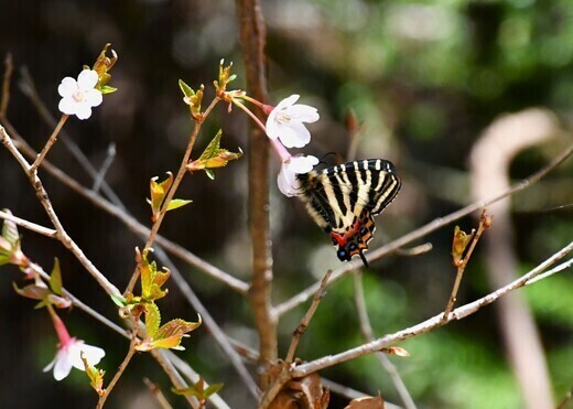 3/19から三泊四日で、鹿児島市内・霧島・日南海岸・佐多岬・指宿温泉と巡ってきたので、出始めのギフチョウは撮影できず。年度末の残務を済ませて、一週遅れで出かけると、すでに尾状突起の破損した♂が見られた。遅れて羽化する♀は新鮮個体ばかり。