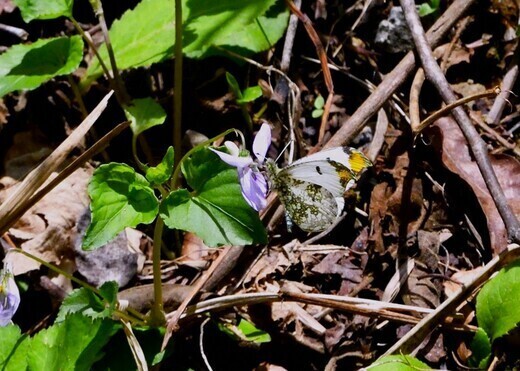 渓流沿いの急な斜面を上下しながら、複数のツマキチョウが飛んでいた。林道の前後を見てクマが現れないことを確認しつつ、見上げながら待つと、偶に目の高さのスミレまで下りてきて吸蜜してくれた。まさにクモマツマキを撮影するようなシチュエーション。